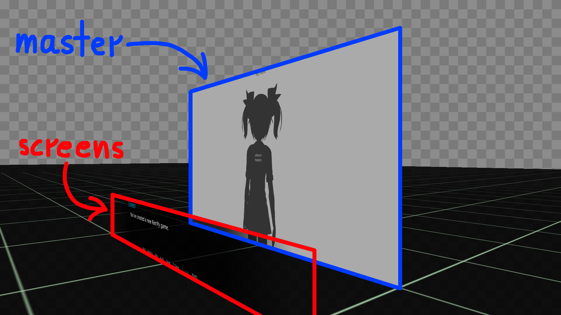 - Screens is Ren'Py's language for UI. This goes in front of your game sprites and backgrounds, on its own layer.