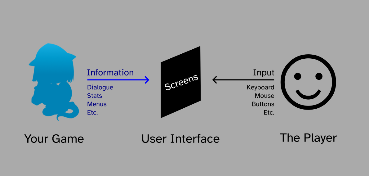 UI is both showing information to the player or getting input from the player. This is how the game knows what the player wants, and how the player knows what's going on in your game. It's a two-way street.